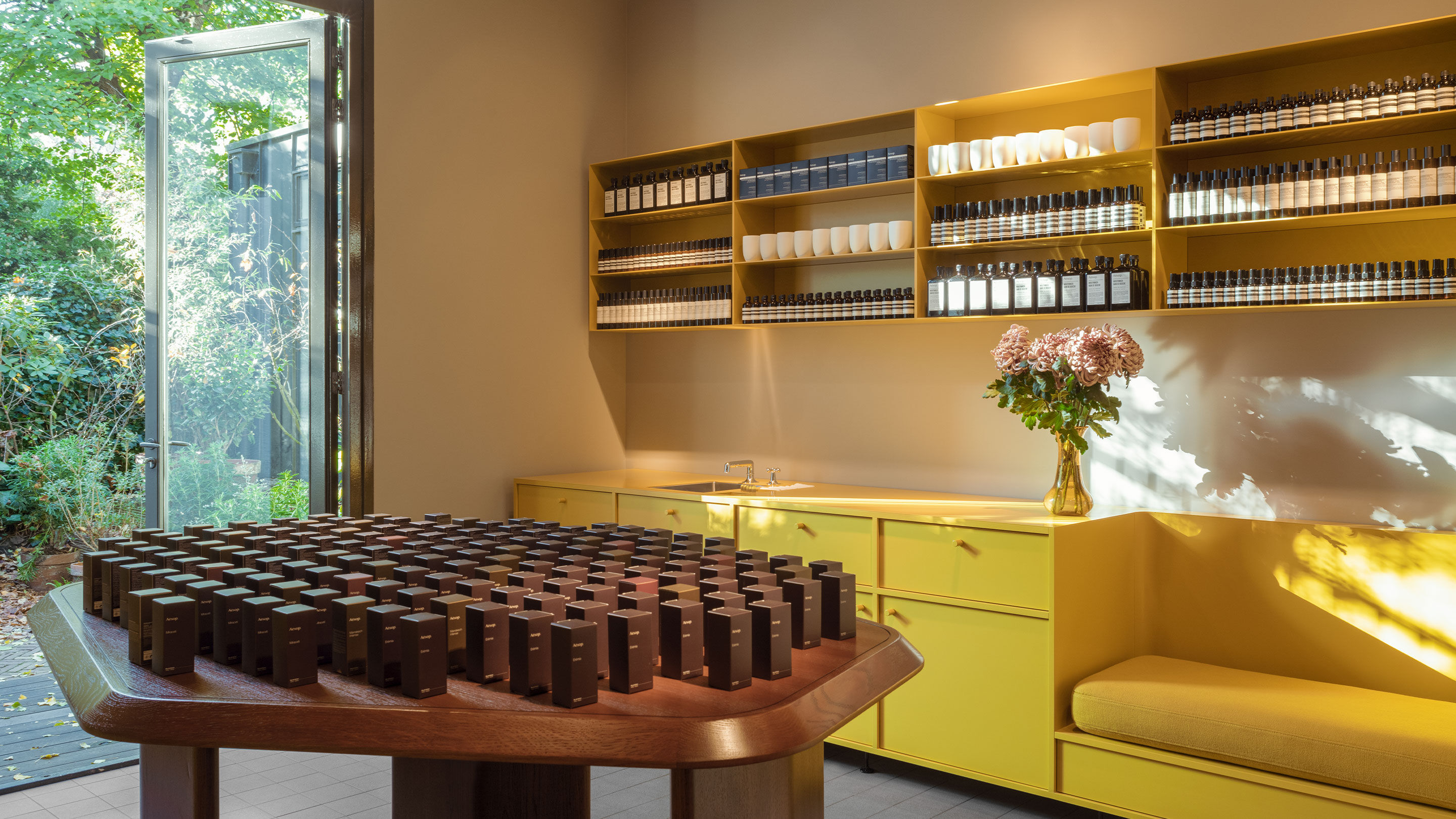 Inspired by the joyful colours and modernist aesthetic of the Nieuwe Bouwen movement, Aesop Nine Streets offers a calming yet genial atmosphere in which to escape the pedestrian traffic.