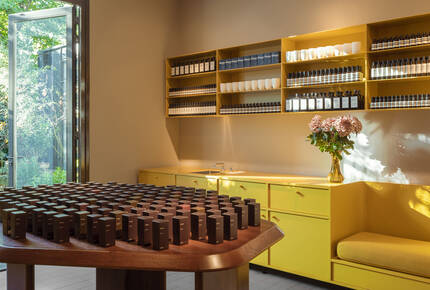 Nestled in the intimate café culture of Runstraat and inspired by the joyful colours and modernist aesthetic of the Nieuwe Bouwen movement, Aesop Nine Streets offers a calming yet genial atmosphere in which to escape the pedestrian traffic. Among the dark brown floors and mellow green walls, the minimalist furniture introduces bright flashes of yellow—adding a warm, uplifting vibrancy.