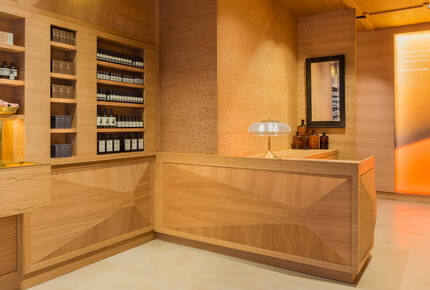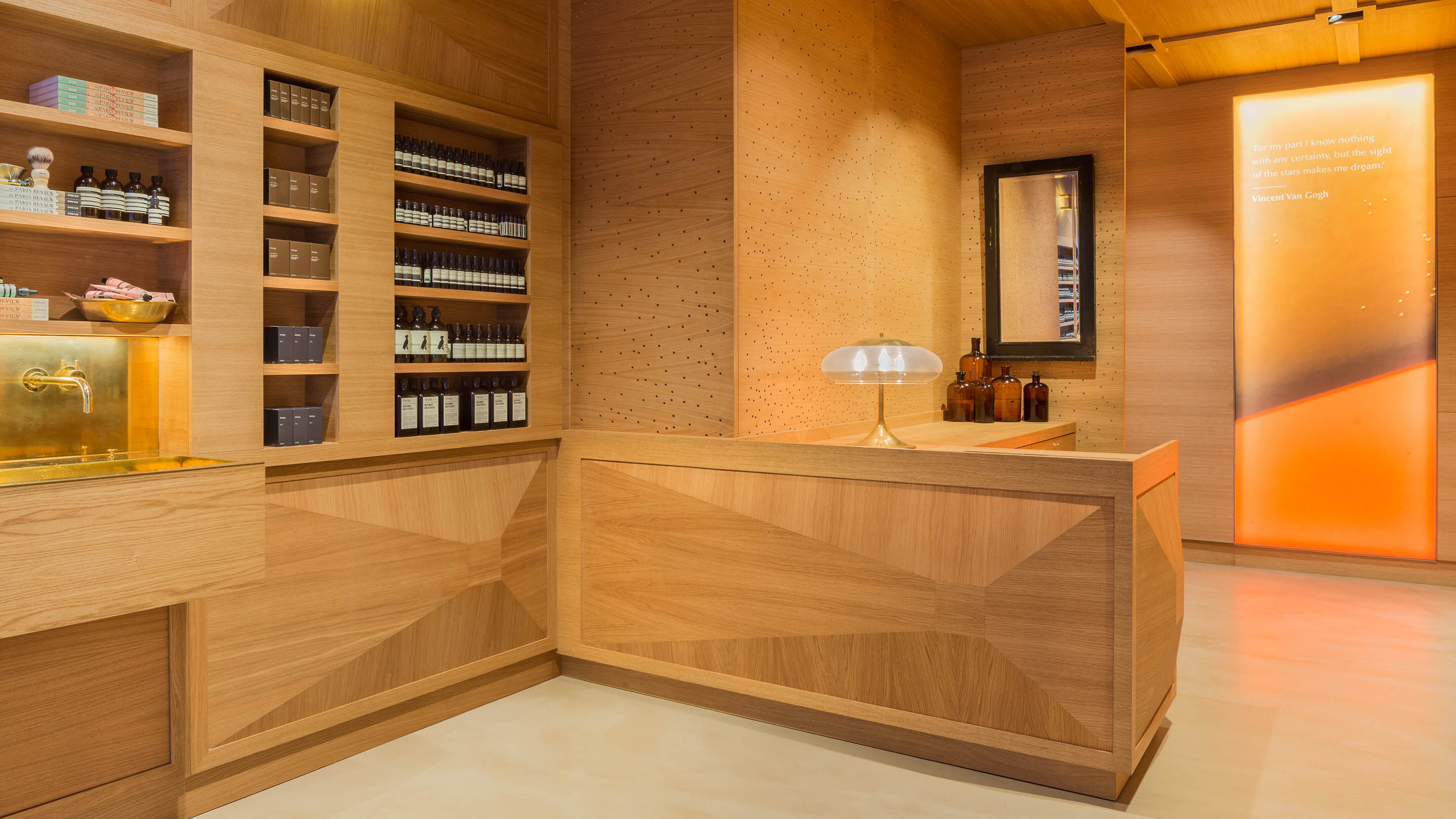 These modulated panels clad wall and counter volumes, with those installed above product shelves featuring integrated lighting fixtures. The same blond Oak furnishes ceiling plane, built-in shelving and a perforated dividing wall that reveals glimpses of light from a concealed stairway leading to the basement level.
