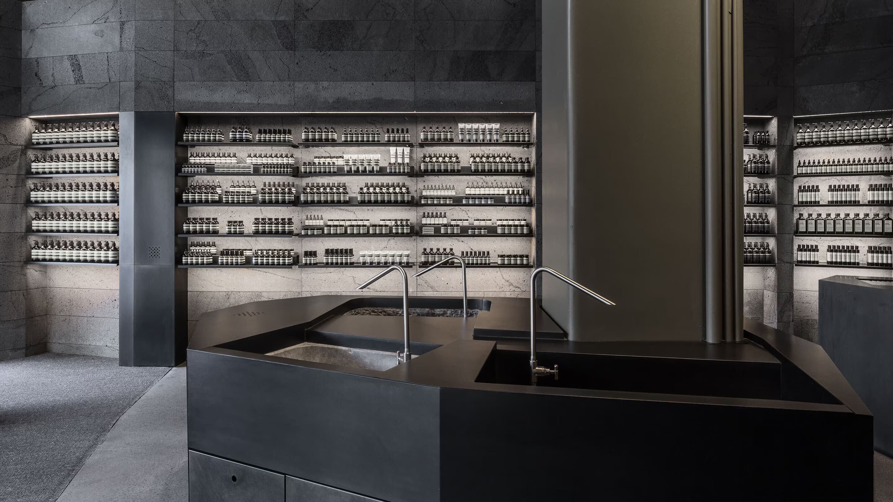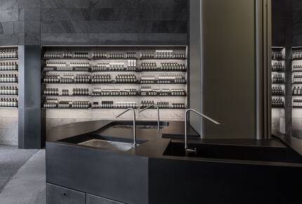 Upon entry, twin faceted steel masses provide a visual through-line. The smaller of these slabs features embedded hand-carved stone troughs and custom taps; the larger, at the rear, constitutes the sales counter. These monolithic forms are complemented by brushed metal shelving, inviting visitors to meander through the space.