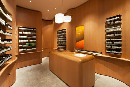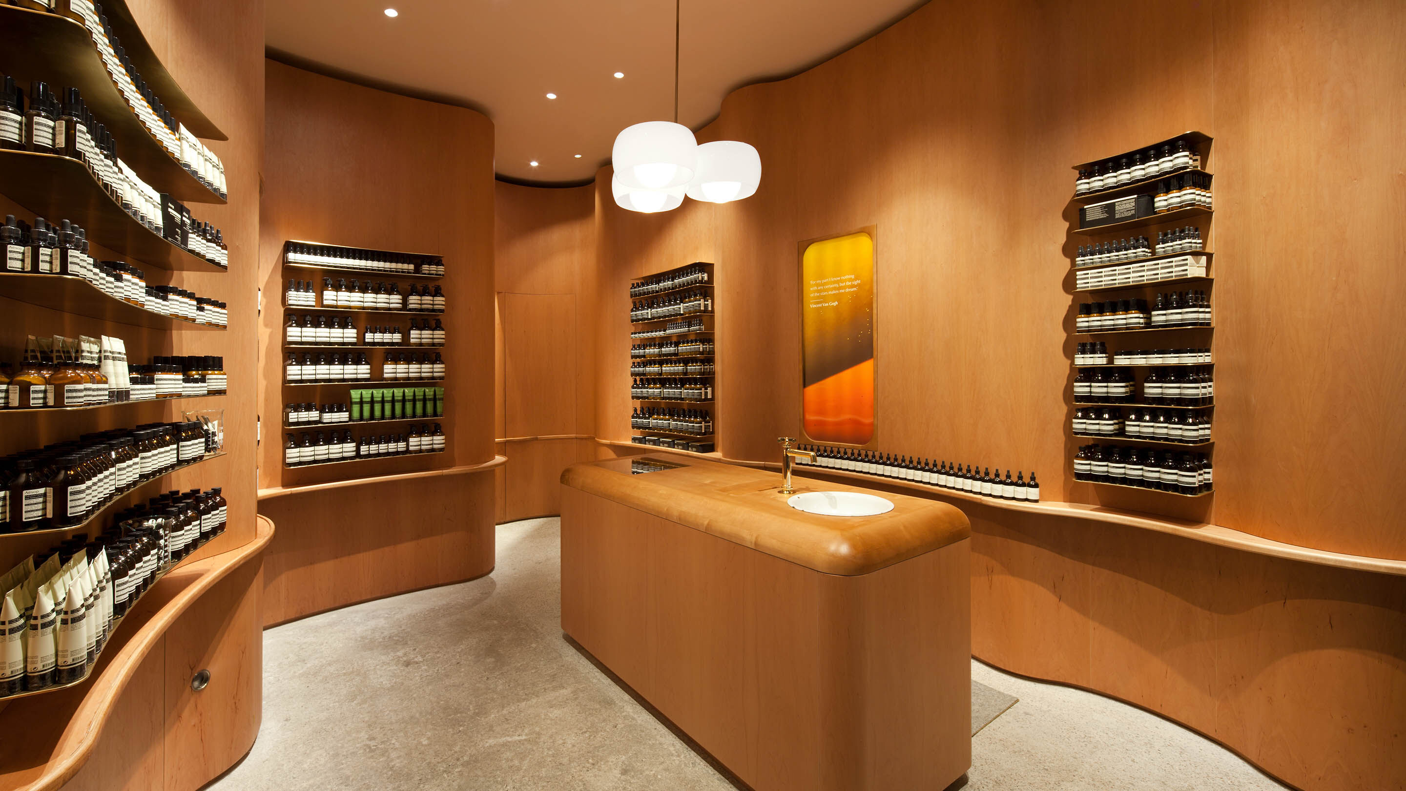 A central unit, also of Alder, guards the rounded edges of the floorplan and houses both the sales counter and a vintage enamelled sink used for product demonstrations. Original concrete flooring has been restored to show a rough, pale grey aggregate that effects an appealing contrast to the rosy hue of its setting.