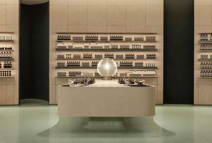 Situated within the bustling Singapore retail centre of the same name, Aesop VivoCity is intended as a quiet escape from the clamour and quick pace of its immediate surroundings. It is a space of softness—undulating curves, tactile materials and hidden enclaves—dreamed up by our in-house design team.
