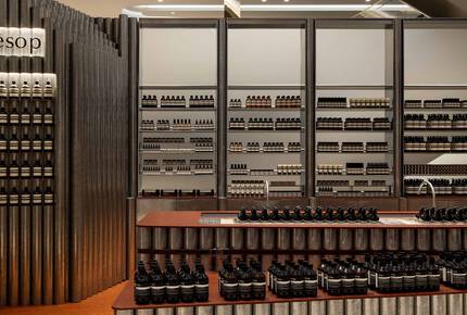 Aesop’s counter within the Kaohsiung E-Skyland mall is a pragmatic repurposing of the furniture and fixtures of the brand's former space in a neighbouring skyscraper. The design continues the previous iteration’s exploration of industrial materials and vertical construction, inspired by Taiwan’s metal manufacturing and ultra-tall buildings—while also inviting a sense of domesticity and enclosure.